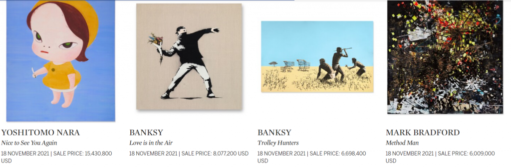 אחד מהסיפורים יוצאי הדופן של השבוע ההיסטורי היה הגשת הצעות בזמן אמת הן ב-Ether (ETH) והן בדולר ארה"ב עבור זוג ציורים איקוניים של בנקסי שהדגישו את המכרז. ההתרגשות הזו רק עזרה לתדלק מכירה לוהטת ממילא של 100% מכרה שהכפילה את ההערכה הנמוכה שלה והסתכמה ב-71.9 מיליון דולר. ההצעות נמשכו בנפח גבוה לאורך כל המכירה עם ממוצע של חמישה מציעים על פני 23 המגרשים שהוצעו. החלק העליון של המכירה היה "Nice to See You Again" של יושיטומו נארה, שגבר על ההערכות לפני המכירה שהרוויחו 15.4 מיליון דולר.