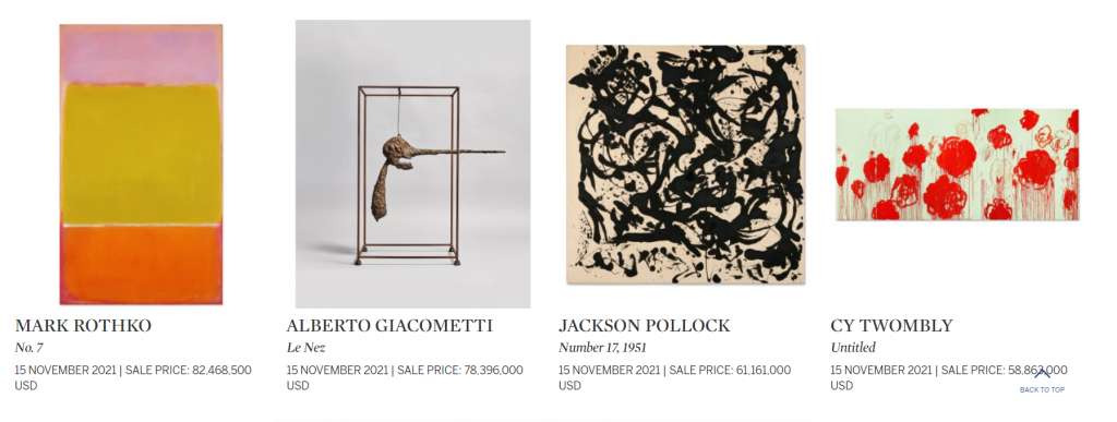 המכירה המצופה מאוד של The Macklowe Collection השיגה סך של 676.1 מיליון דולר בזכות יצירות מופת של האמנים החשובים ביותר ב-80 השנים האחרונות. נקודות השיא של הערב כללו את ה-7 של מארק רותקו, שנמכר ב-82.5 מיליון דולר, את Le Nez של אלברט ג'קומטי, שהשיג 78.4 מיליון דולר, את מספר 17 של ג'קסון פולוק, 1951, שיותר מהכפיל את ההערכה הנמוכה שלו והשיג 61.2 מיליון דולר, שיא אמן חדש. , והסרט המונומנטלי Untitled של Cy Twombly, שנמכר ב-58.9 מיליון דולר.