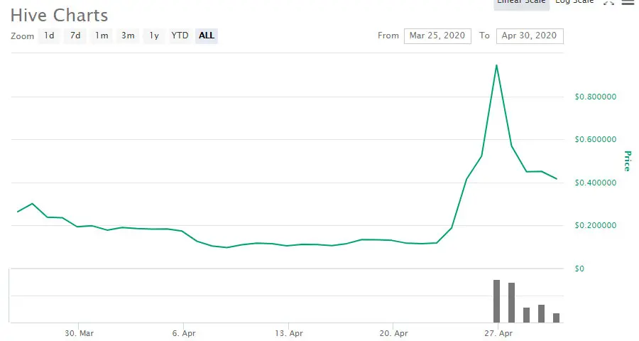 המחיר של HIVE עלה בכמעט 800% מה-22 באפריל 2020 עד ה-27 באפריל 2020 כאשר מספר בורסות גדולות, כולל Huobi Global ו-Binance, רשמו את האסימון למסחר.