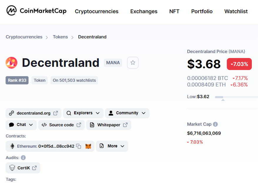 MANA הגיעה לשיא של כל הזמנים בינואר 2018 ב-0.26 דולר, והגיעה לשני שיאים נוספים במאי וביולי, 0.18 דולר ו-0.14 דולר בהתאמה. מאז יולי 2018 MANA המשיכה לרדת, מה שמשקף את המגמות של שוקי הקריפטו. נכון לזמן כתיבת שורות אלה בשנת 2021 MANA חווה עלייה דרמטית בשווי המטבע יחד עם כל שוק הקריפטו ונסחר סביבות3.68$ כאשר הוא ממוקם במקום ה33 ברשימת המטבעות המובילים של CMC
