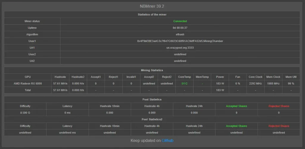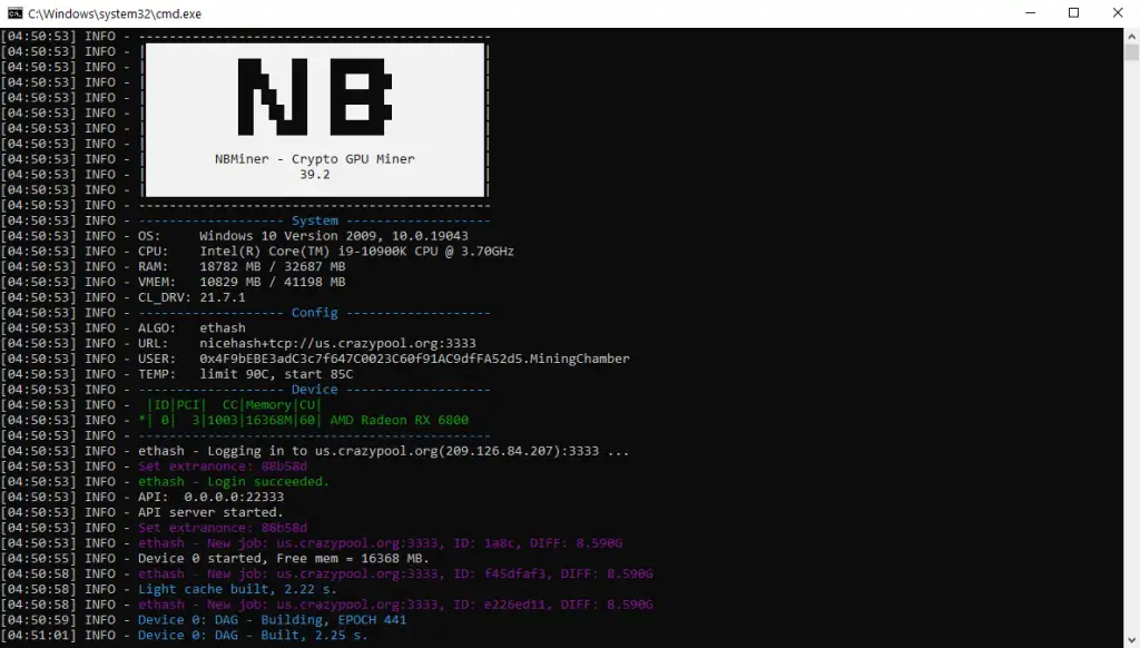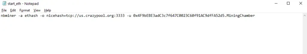 "C:UsersUSERNAMEDesktopMinersNBMiner_39.2_Winnbminer" -a ethash -o nicehash+tcp://us.crazypool.org:3333 -u 0x4F9bEBE3adC3c7f647C0023C60f91AC9dfFA52d5.MiningChamber -mt 0,2 -lhr-mode 2