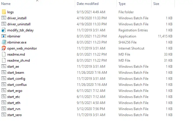 לבסוף נשארת עם ה-README שהוא רק קבצי ההוראות שנעבור עליהם בסעיף הבא ולאחר מכן תיקיית היומנים שמכילה רק יומנים של הפעלות ה-NBMiner שלך. הם יכולים להיות שימושיים כדי לזהות את הבעיה אם הכורה שלכם קורס.
